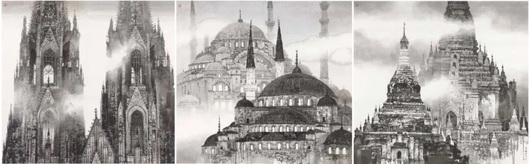 刘建 苍穹同在——佛塔·教堂·清真寺 国画 179cm×192cm×3