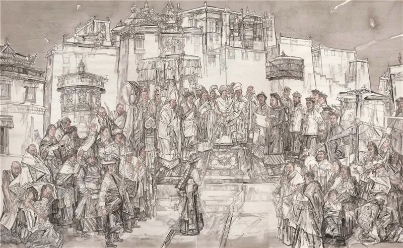 吕书峰 顺治帝遣使恭迎达赖五世赴京册封 国画 366cm×596cm